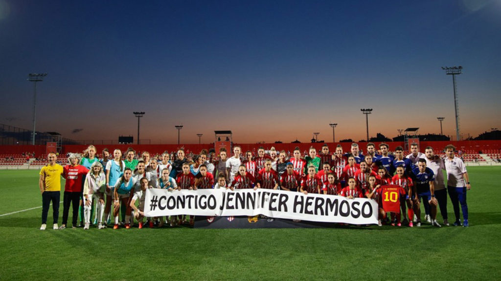 Las jugadoras de ambos conjuntos posaron con una pancarta mostrando su apoyo a Jenny Hermoso. Además, la capitana del Atlético subió a por el trofeo con la camiseta de su compañera del Pachuca.