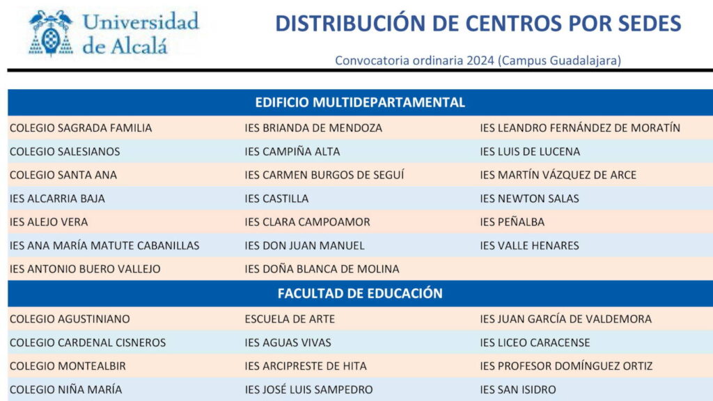 Según el centro de secundaria del que procedan, los estudiantes matriculados realizarán las pruebas en los edificios de Medicina, Ciencias, Ciencias Ambientales, Enfermería y Fisioterapia y la Escuela Politécnica, ubicados en el Campus Científico Tecnológico de Alcalá; o en el Edificio Multidepartamental y la Facultad de Educación del Campus de Guadalajara.