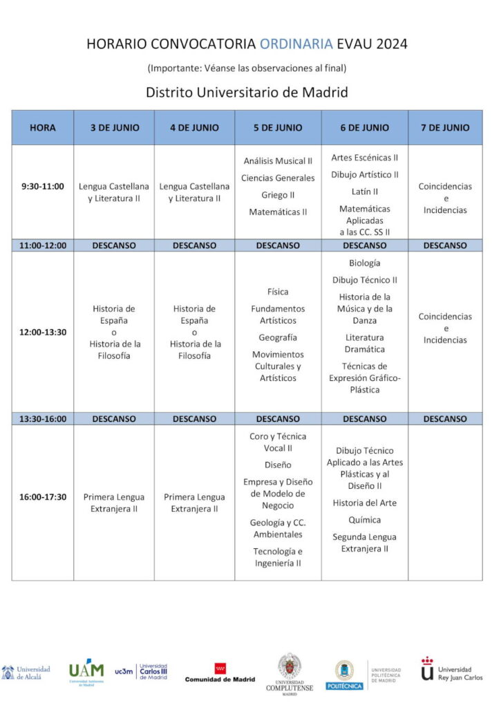 Además, se conservan las orientaciones y criterios de evaluación y corrección que ya fueron informados a comienzos del curso. En cuanto a los horarios, los exámenes se realizarán de 09:30 a 11:00 horas, de 12:00 a 13:30 y de 16:00 a 17:30. El llamamiento será, al menos, 30 minutos antes de comenzar cada prueba.