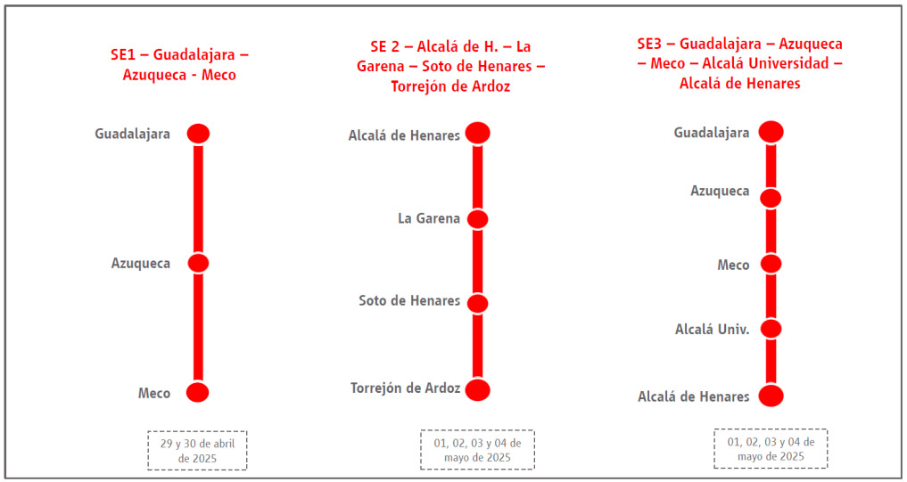 Funcionará los días 29 y 30 de abril de 5:00 (Guadalajara) a 0:40 horas (Meco) y tendrá una frecuencia de entre 10 y 20 minutos