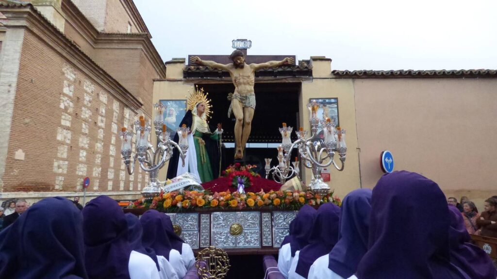 Pero apenas recorridos unos metros por la calle Gallo tuvieron que detenerse en la plaza de las Agustinas. La lluvia no era copiosa, pero amenazaba la seguridad la talla del Crucificado (finales del s. XVII y restaurada en 2006) y de la Virgen de la Misericordia.