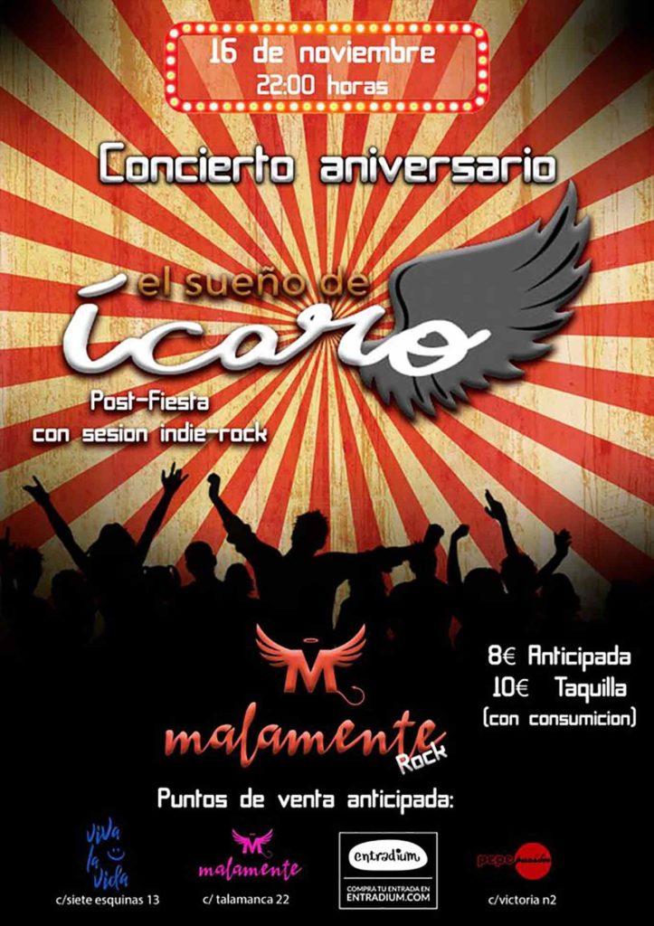 Cumpleaños feliz para la banda alcalaína El Sueño de Ícaro que cumplen 20 temporadas sobre los escenarios. Un grupo con una calidad envidiable encima de las tablas. Una celebración que quieren compartir con todos sus fans en un especial Concierto 20 Aniversario.