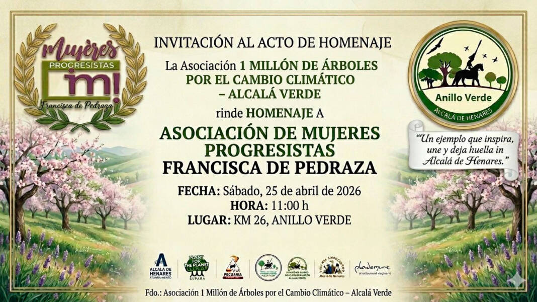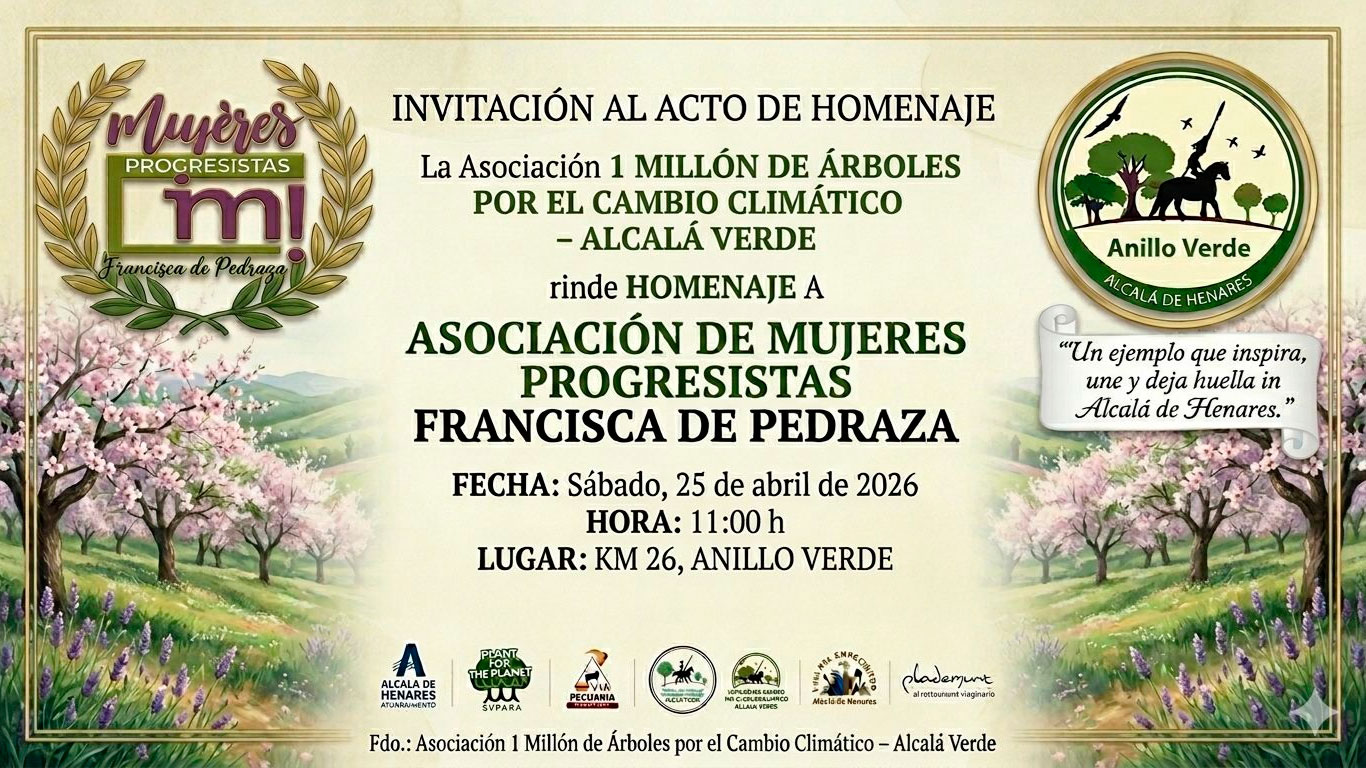 La asociación 1 Millón de Árboles por el Cambio Climático – Alcalá Verde invita a toda la ciudadanía a un acto muy especial dentro de su proyecto del Anillo Verde de Alcalá de Henares, una iniciativa que continúa creciendo como referente en sostenibilidad, participación ciudadana y puesta en valor del entorno natural y cultural.