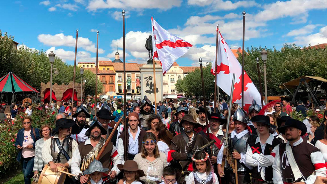 Debido a ello, Alcalá de Henares también tiene sus soldados de los Tercios. Pero no se trata de militares del siglo XVI sino de soldados y doncellas muy actuales que cada 9 de octubre, día del bautismo del escritor, rinden homenaje al Cervantes Soldado en el Mercado Cervantino.