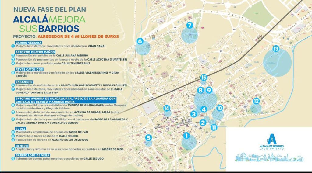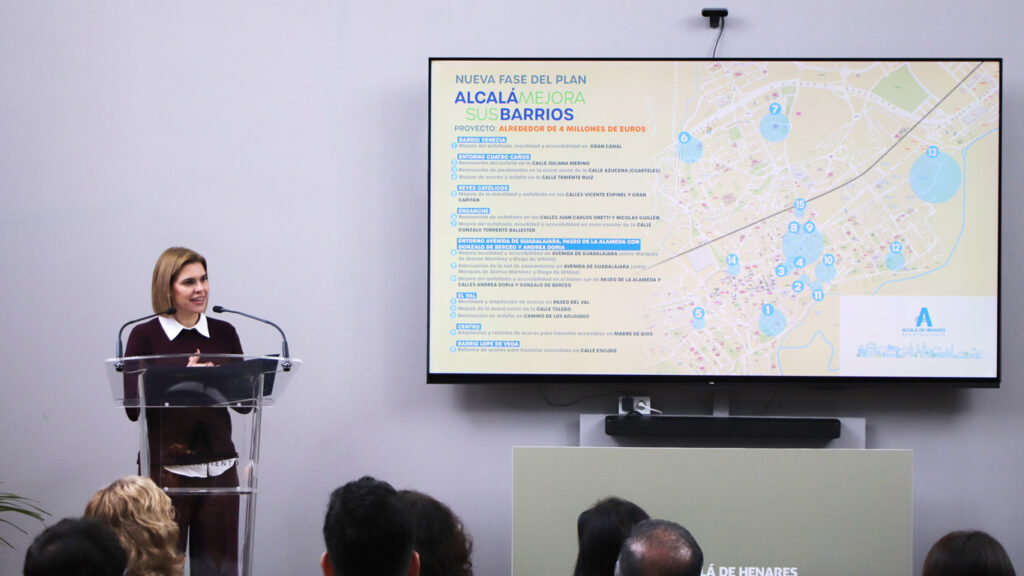 El Gobierno de Alcalá de Henares continúa con su Plan Alcalá mejora sus barrios. La alcaldesa Judith Piquet ha anunciado nuevas actuaciones en las que se invertirán alrededor de 4 millones de euros en materia de movilidad, accesibilidad, saneamiento y renovación del pavimento en las que se invertirán en torno a cuatro millones de euros. Estas inversiones llegarán a diferentes barrios de la ciudad, como Gran Canal, Paseo del Val, El Ensanche, El Ensanche, Paseo de la Alameda, Azucena, entorno de Reyes Católicos o el Camino de los Afligidos, entre otros. El acto ha contado con la presencia de los tenientes de alcalde Isabel Ruiz Maldonado, Víctor Acosta, Gustavo Severien y Cristina Alcañiz, así como otros miembros del Gobierno municipal.