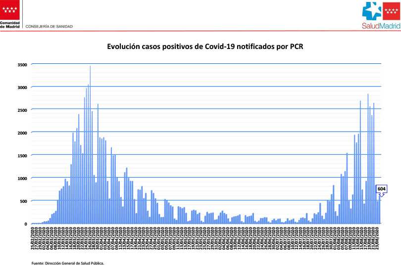 Al cierre del día de ayer, 24 de agosto, la Comunidad de Madrid suma un total de 114.096 pacientes afectados por COVID-19 en datos contrastados con prueba PCR desde el principio de la pandemia, 1.907 más que ayer. La Consejería de Sanidad ofrece el dato de 1907 casos nuevos notificados incorporados, siendo 604 los comunicados en las últimas 24 horas.