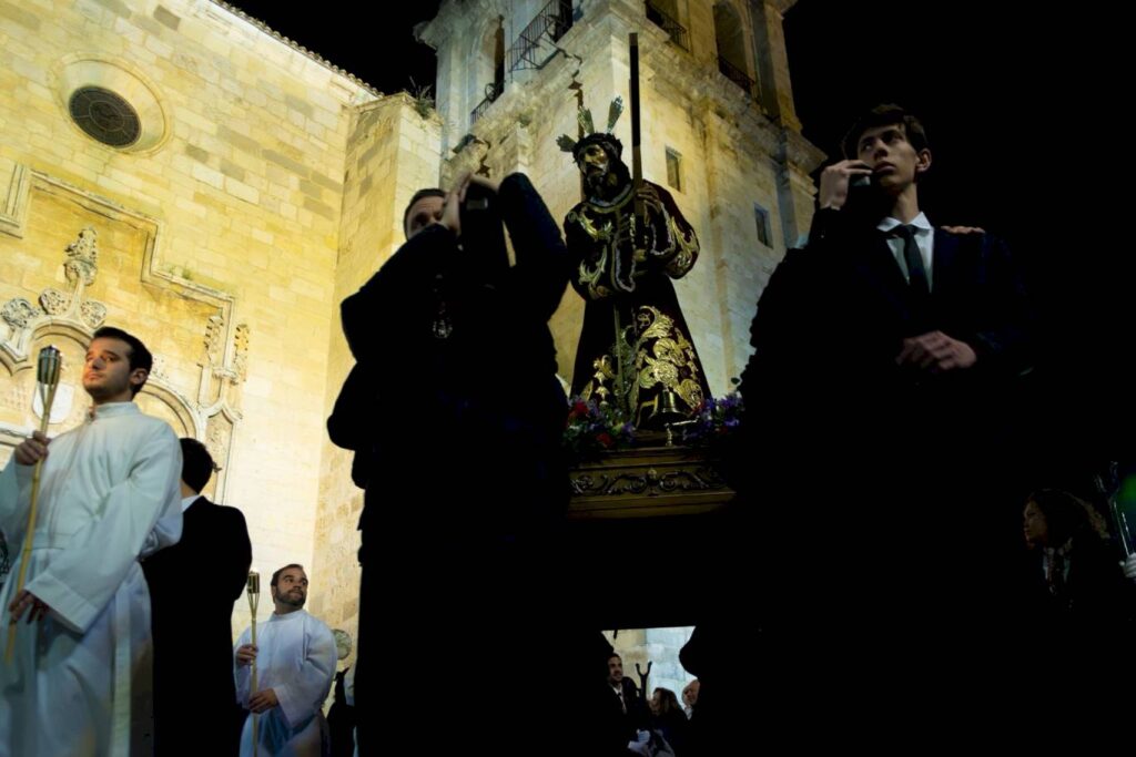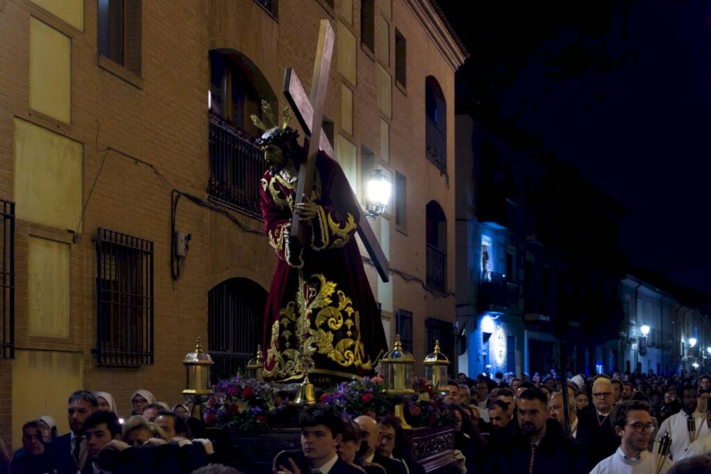 El cortejo avanzó lentamente por el trazado previsto, recorriendo calles como Tercia, Damas, Infanta Catalina o la calle Empecinado, en un itinerario que volvió a dibujar un recorrido íntimo por el corazón de la ciudad. La ausencia de música, característica de esta hermandad, reforzó la atmósfera de recogimiento, rota únicamente por el sonido de la campana que guía a los costaleros.