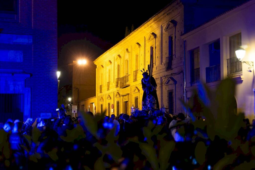 Uno de los momentos más esperados fue, una vez más, la salida del paso de María Santísima de las Angustias con el Santísimo Cristo de los Desamparados. La talla representa a la Virgen sosteniendo el cuerpo sin vida de su hijo tras ser descendido de la Cruz, una escena de profundo dramatismo que cada año conmueve a los asistentes.