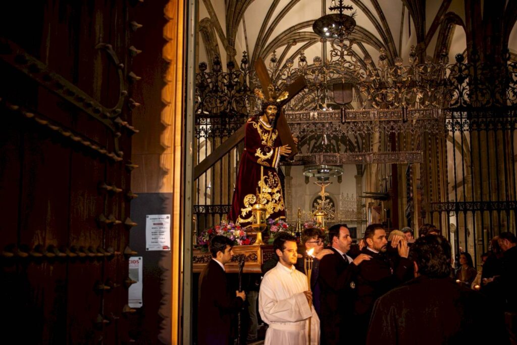 El itinerario volvió a ofrecer estampas de gran belleza en lugares como Siete Esquinas, la calle Santa María la Rica o la plaza del mismo nombre, donde la iluminación tenue y la cercanía del público generaron momentos de especial intensidad. La procesión continuó por la calle Cárcel Vieja y regresó hacia la plaza de los Santos Niños, cerrando el círculo en la Catedral Magistral.