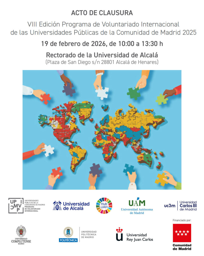Así, el 19 de febrero, de 10:00 a 13:30 horas, junto al edificio del Rectorado de la Universidad podrás asistir a este acto de clausura de la VIII Edición del Programa de Voluntariado Internacional de las Universidades Públicas Madrileñas.