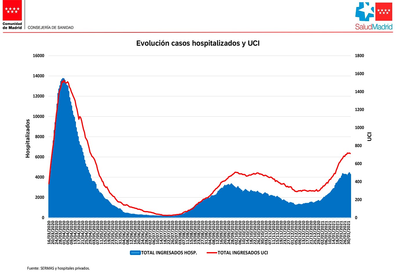 Además, hay 4.269 pacientes hospitalizados (ingresados en el día) para un total acumulado de 90.116. Son 149 menos que el día anterior, es uno de los descensos más acusados del mes de enero y corta la clara tendencia al alza de los últimos dos días.