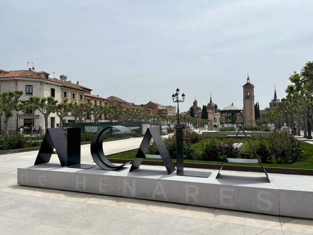 La renovación de la plaza incluye también nuevos elementos distintivos, como la instalación del nombre de Alcalá de Henares en grandes letras de acero pulido y la firma de Cervantes en bronce en el pavimento frente a su estatua.