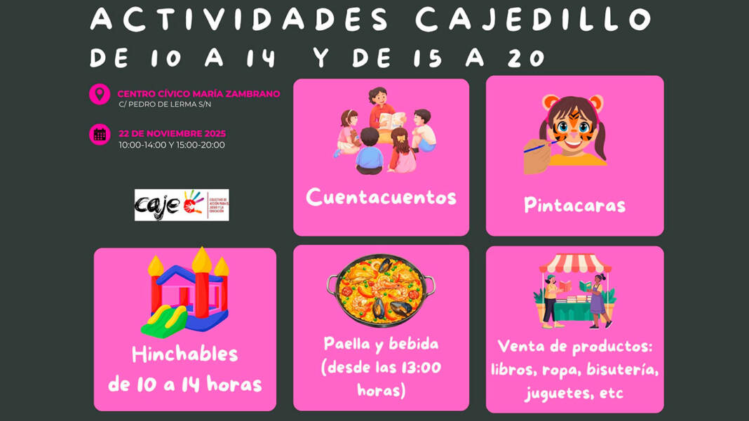 Desde CAJE vuelven a preparar su divertida actividad a la que llaman CAJEDILLO. ¿Y qué es el CAJEDILLO?, os preguntaréis. Desde CAJE nos cuentan que es un espacio lúdico, con actividades para niños y para adultos (música, magia, cuentacuentos), donde compartir, tomar un refresco y hablar de CAJE, además de poder colaborar con el desarrollo de sus actividades con un espacio de venta de productos.