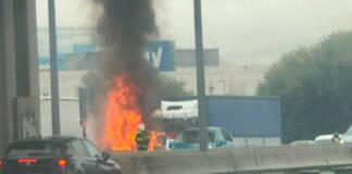 Varios kilómetros de atasco en la A-2 por un coche ardiendo en la vía de servicio de El Corte Inglés