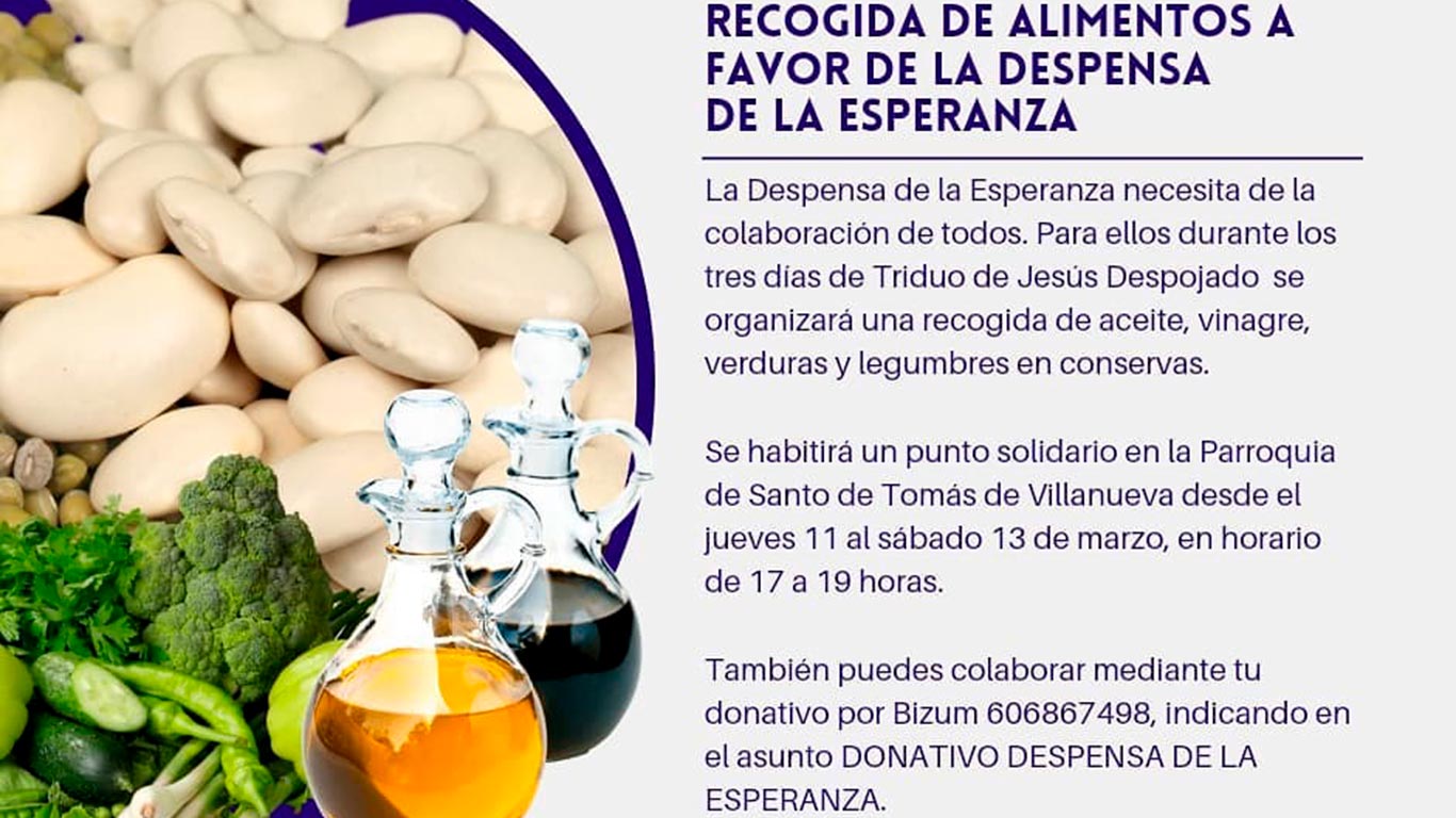 La Despensa de la Esperanza gestionada por la Hermandad de Jesús Despojado en la Parroquia de Santo Tomás de Villanueva del barrio de Espartales organiza durante tres días consecutivos una recogida de alimento que será el primer suministro de la Despensa de la Esperanza, un economato que atenderá a las familias más necesitadas de Alcalá de Henares.
