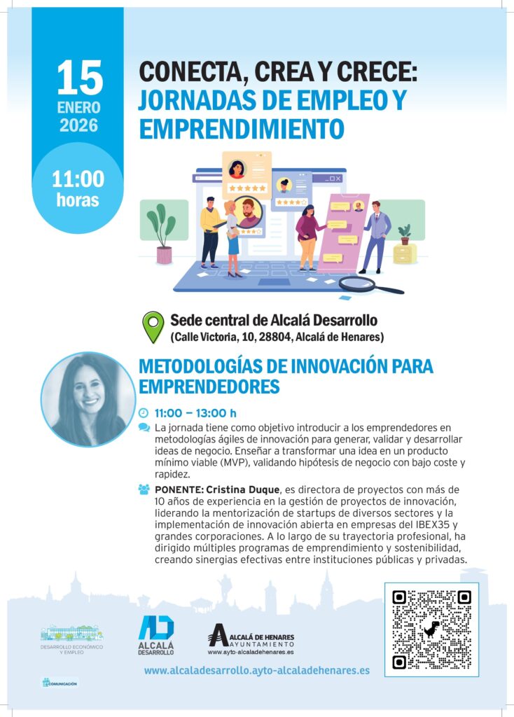 Esta nueva sesión tendrá lugar este el jueves 15 de enero, de 11:00 a 13:00 horas, en la sede central de Alcalá Desarrollo (C/ Victoria, 10), bajo el título ‘Metodologías de innovación para emprendedores’. La jornada será impartida por Cristina Duque, experta en innovación y mentorización de startups, con más de diez años de experiencia en programas de emprendimiento e innovación abierta.