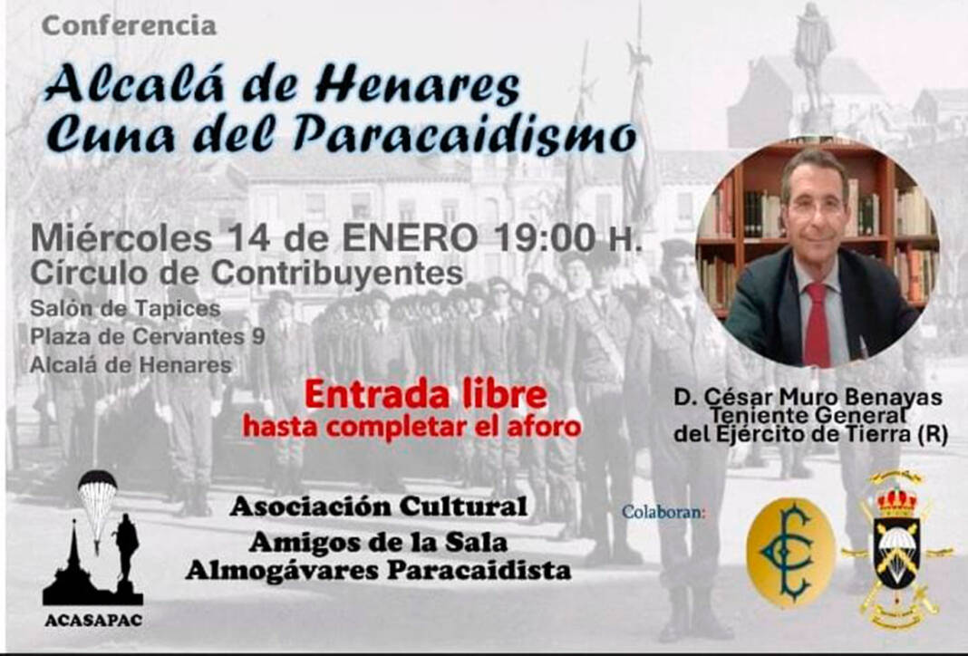 La Asociación Cultural Amigos de la Sala Almogavares Paracaidista (ACASAPAC) inicia su ciclo de conferencias de 2026 con un evento que se celebra el próximo 14 de enero. Bajo el título ‘Alcalá de Henares, cuna del paracaidismo militar’, el teniente general César Muro Benayas abrirá el ciclo.