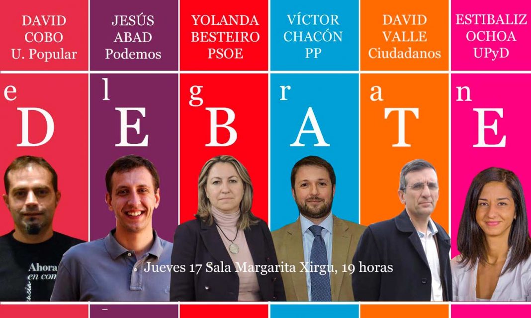 El Debate Electoral de Alcalá contó con los seis grupos políticos de Alcalá: Yolanda Besteiro del PSOE, Víctor Chacón del PP, David Valle de Ciudadanos, Jesús Abad de Podemos, Estíbaliz Ochoa de UPyD, y David Cobo de Unidad Popular,.