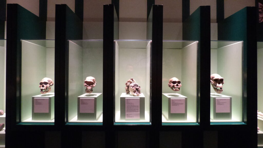Junto a ellos, se exponen las réplicas de cráneos y esqueletos completos aparecidos en yacimientos europeos y norteamericanos como Haile 21 A o Rancho La Brea (ambos en EE. UU.).