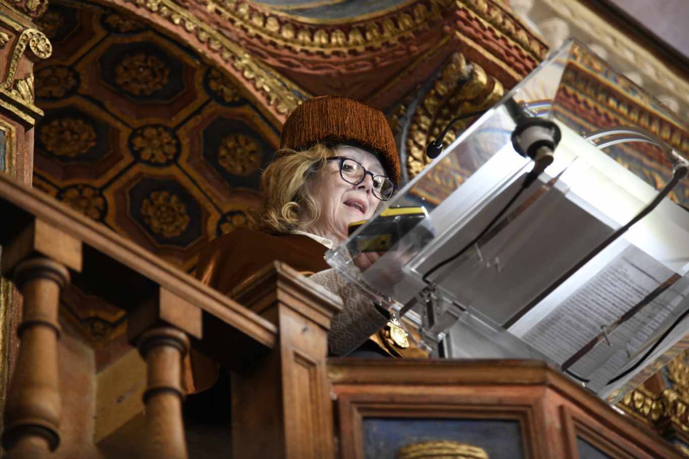 Posteriormente, la ceremonia ha proseguido en el Paraninfo, donde la profesora Pilar Chías, catedrática de Expresión Gráfica Arquitectónica de la UAH, ha ofrecido la conferencia ‘Amoenitas loci, paupertas, caritas. Imágenes de la fundación de Cisneros’, que ha versado sobre los intereses que rondaban la mente de Cisneros para diseñar una ciudad a la medida de las actividades universitarias.
