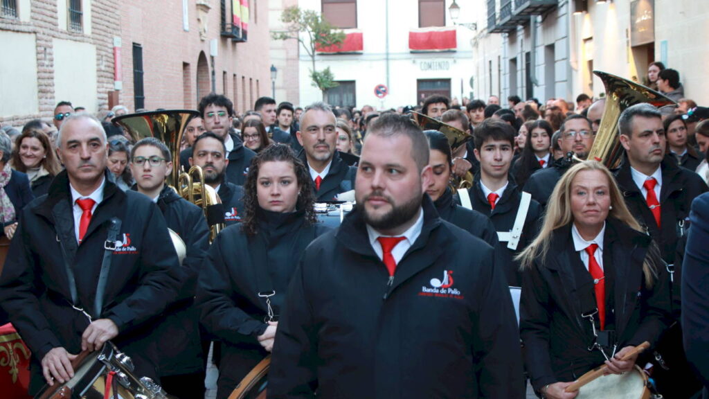 La música volvió a desempeñar un papel fundamental en el desarrollo de la procesión, marcando el ritmo del avance de los pasos y contribuyendo a crear una atmósfera cargada de simbolismo. Las marchas procesionales acompañaron cada instante, desde la salida hasta los tramos finales del recorrido. Acompañando al Cristo, la Agrupación Musical Pasión y Muerte de Ajalvir, y la Banda Sinfónica de Juventudes Musicales para el paso de Palio de María Santísima de las Lágrimas.