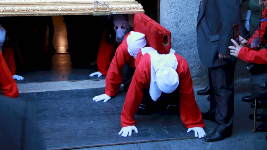 Tras la salida, el paso del Cristo, portado con gran esfuerzo por los anderos, avanzó lentamente por las estrechas calles del centro histórico, en un recorrido que exige una gran coordinación y resistencia física. Tal y como ha ocurrido en años anteriores, la complejidad del trayecto y el peso de las andas convierten cada maniobra en un desafío para los portadores.