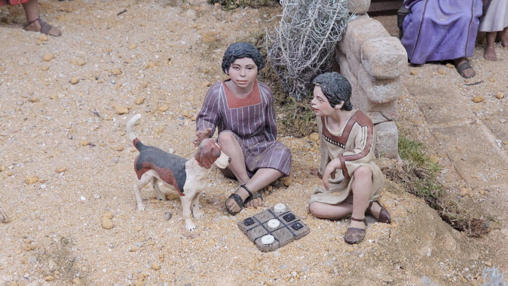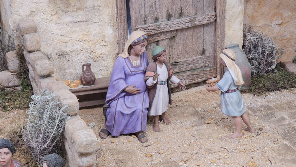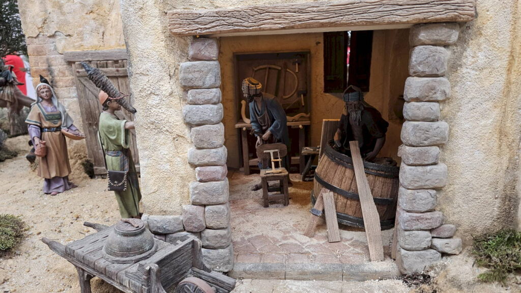 A partir del cauce, el visitante encuentra un recorrido más centrado en la vida diaria del pueblo: artesanos, niños jugando en la plaza, mujeres recogiendo agua, puestos con tinajas, sacos y cestas, y oficios como el del carpintero, que aparece en un lugar destacado rodeado de herramientas y materiales propios del trabajo de la madera.