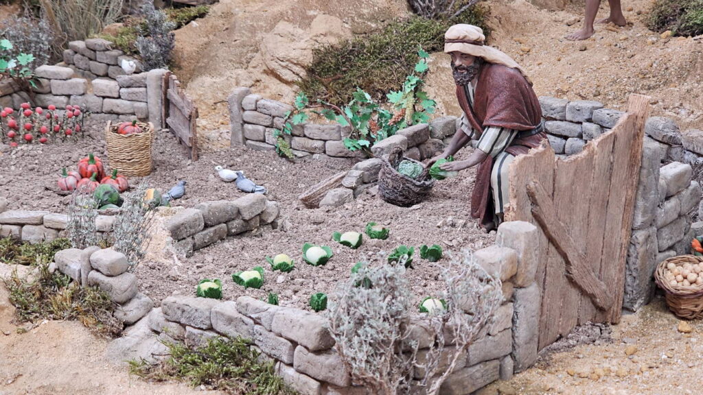 Este año, además, se ha incorporado un huerto, una escena poco habitual en los montajes de la asociación, elaborada con verduras y hortalizas modeladas a mano para reproducir el cultivo tradicional.