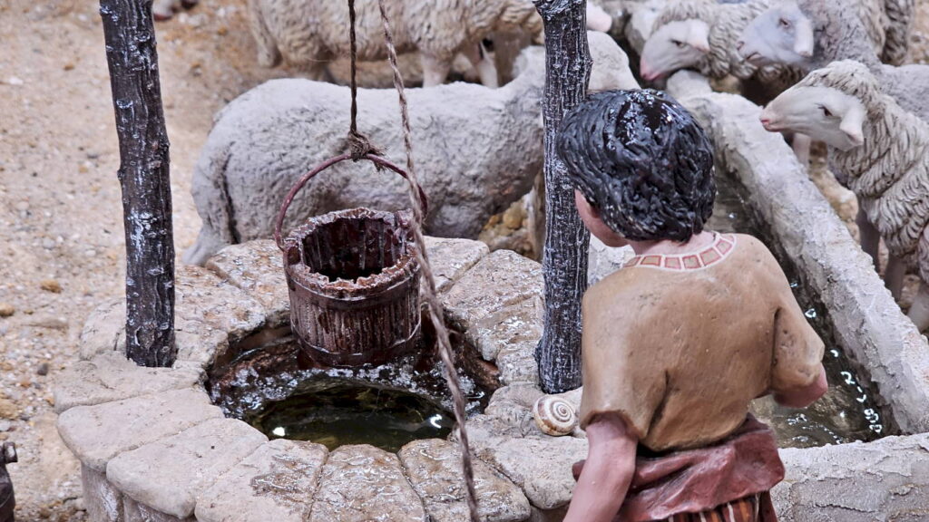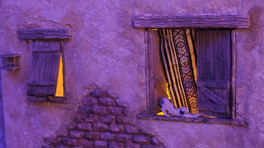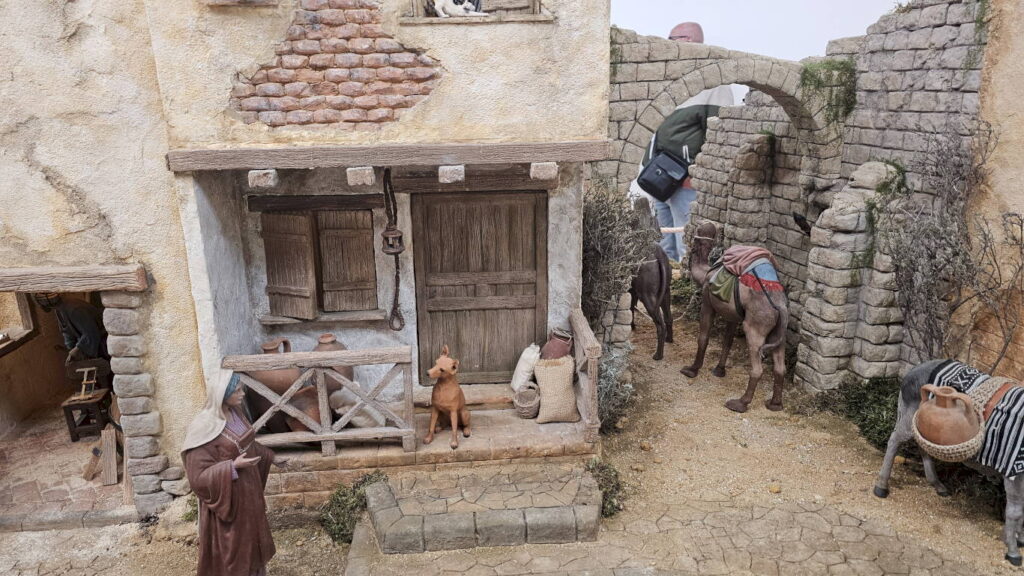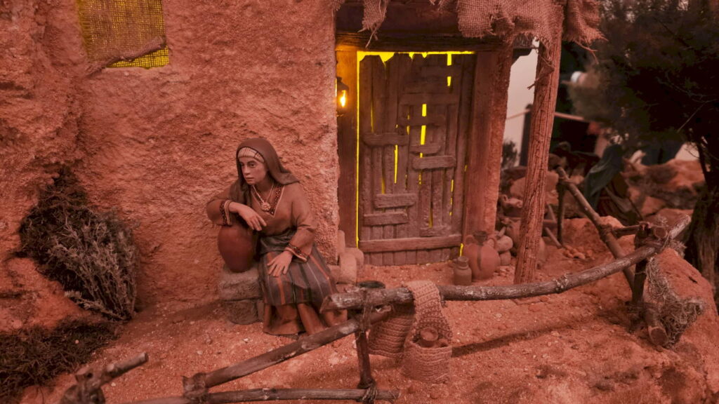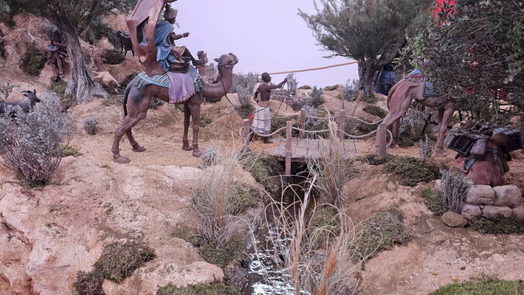 Uno de los tramos más espectaculares es el que rodea al río —realizado en resina, aunque acompañado de una fuente de agua real con bomba— donde se sitúa la caravana de los Reyes Magos. Las figuras avanzan por el sendero mientras vecinos del poblado observan su llegada con sorpresa, en una escena llena de movimiento y dinamismo.