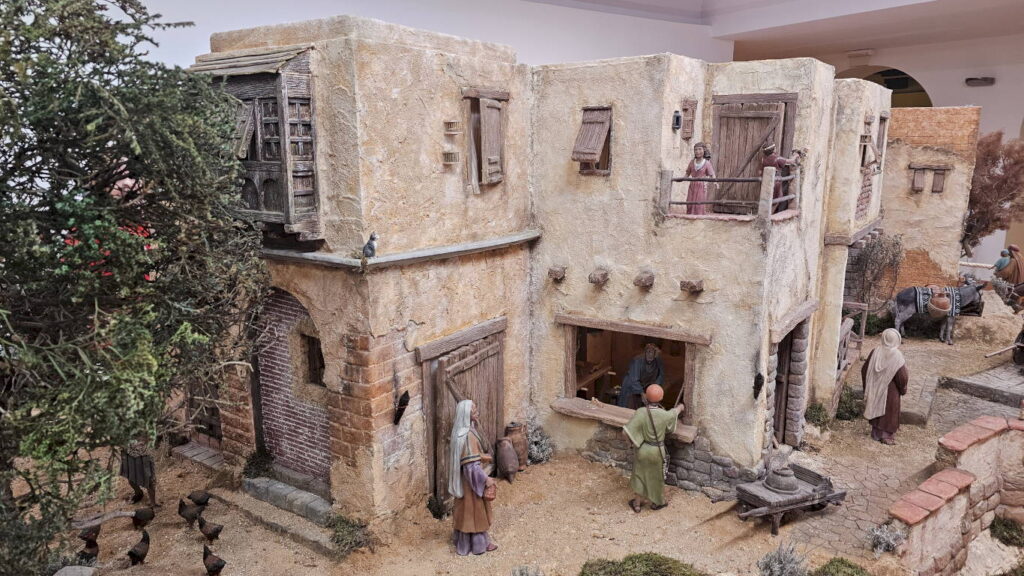 El montaje mantiene su estilo hebreo, característico de los belenes tradicionales de la asociación. La construcción aprovecha, por ejemplo, la forma de la cueva para modelar las montañas, integrando edificaciones que imitan la textura de la tierra y recrean la vida cotidiana de la época.