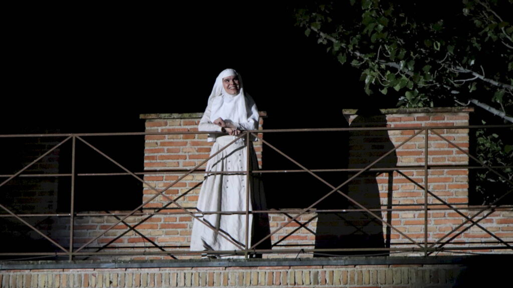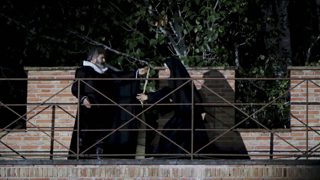 En el Acto III (Profanación) primera aparición de Doña Inés en el Don Juan en Alcalá 2025. El escenario, el Convento de las Calatravas en la misma terraza de la Muralla que pareció alejar la historia del público. Y eso que la novicia estuvo magnífica desde la lectura de la carta de Don Juan hasta que el Tenorio se la llevó a hombros a su Quinta, apoyada por tres de los mejores secundarios del Tenorio -La Abadesa (Natalia Calderón), su padre Don Gonzalo de Ulloa (Rodrigo Sáenz de Heredia) y La Tornera (Mercedes Lur)-.
