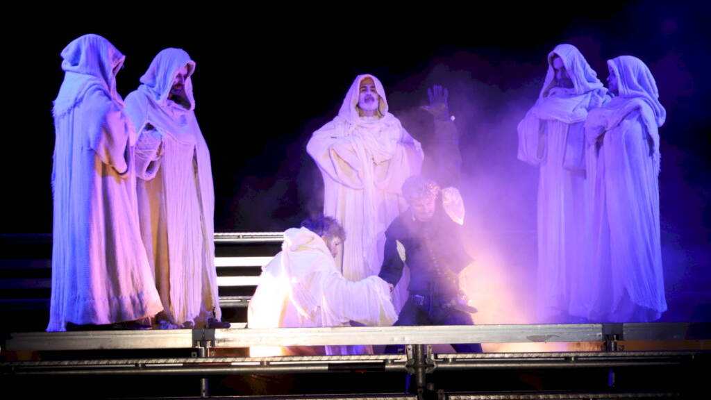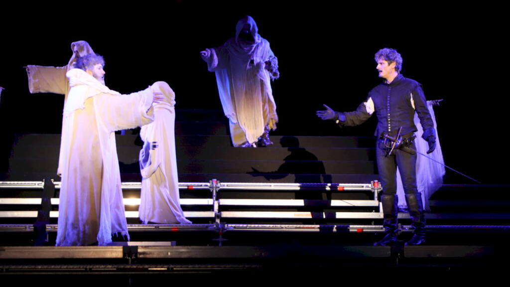 Como hiciera en 2024, antes de que el público se sumergiese en la azarosa vida de Don Juan en la Sevilla de mediados del siglo XVI, el Tenorio de Yllana llegó ‘La Leyenda’. Un pequeño acto previo donde una procesión de antorchas con 14 actores en las almenas de la muralla se reunía para citar el fragmento ‘Memoria amarga de mí’. Es después cuando, por primera vez, aparece el Tenorio con su famoso ‘¡Cuán gritan esos malditos!’, antes de disparar para comenzar la representación. Sin cambios, ni en el número de actores, respecto al pasado año.