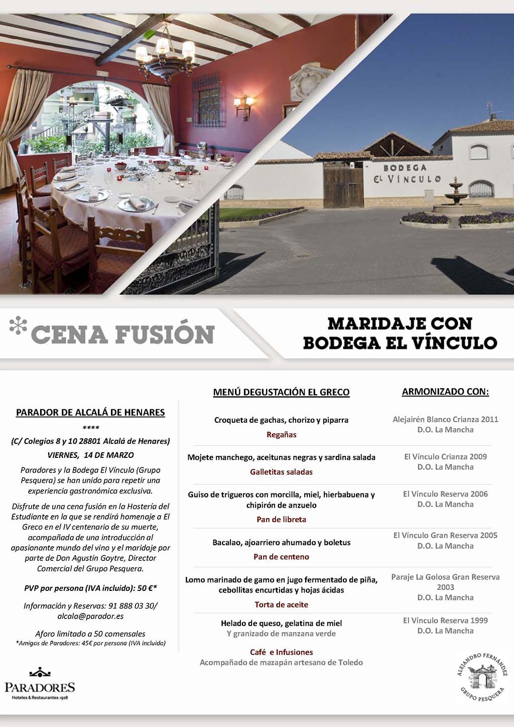 The best of Paradores’ gastronomy joined with the best wines from El Vínculo Winery. On March 14 at the Hostería del Estudiante of the Parador de Alcalá.