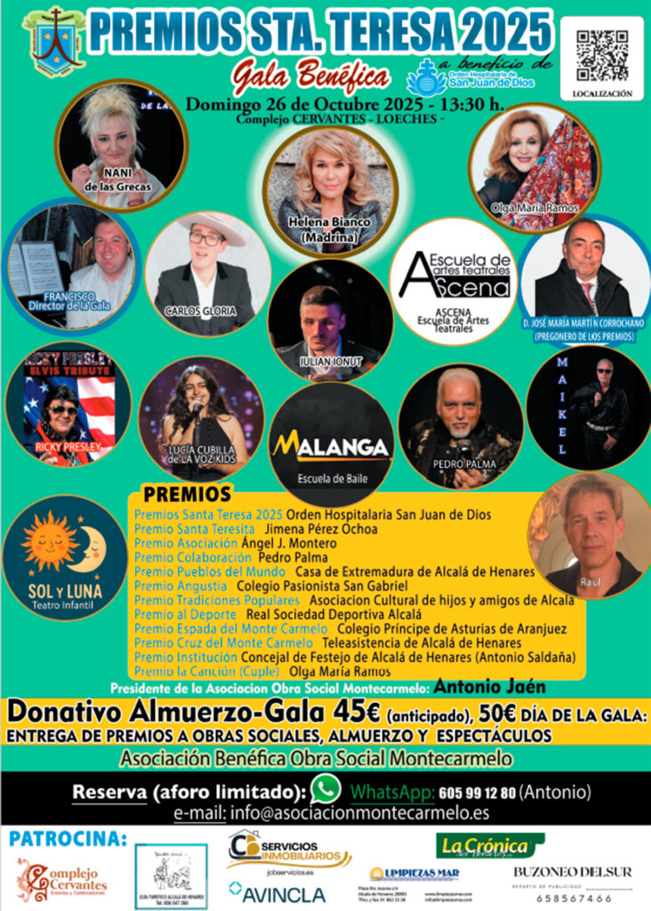 Así, el próximo domingo 26 de octubre, en el en el Complejo Cervantes de la vecina Loeches (Carretera M206 Torrejon a Km 2,6, M-206, Km 2, 600) tendrá lugar la entrega de galardones para después celebrar el almuerzo de la Gala de Entrega de los Premios Santa Teresa 2025 que contará con la entrega de premios a valores y obras sociales, además de un magnífico menú y un gran espectáculo.