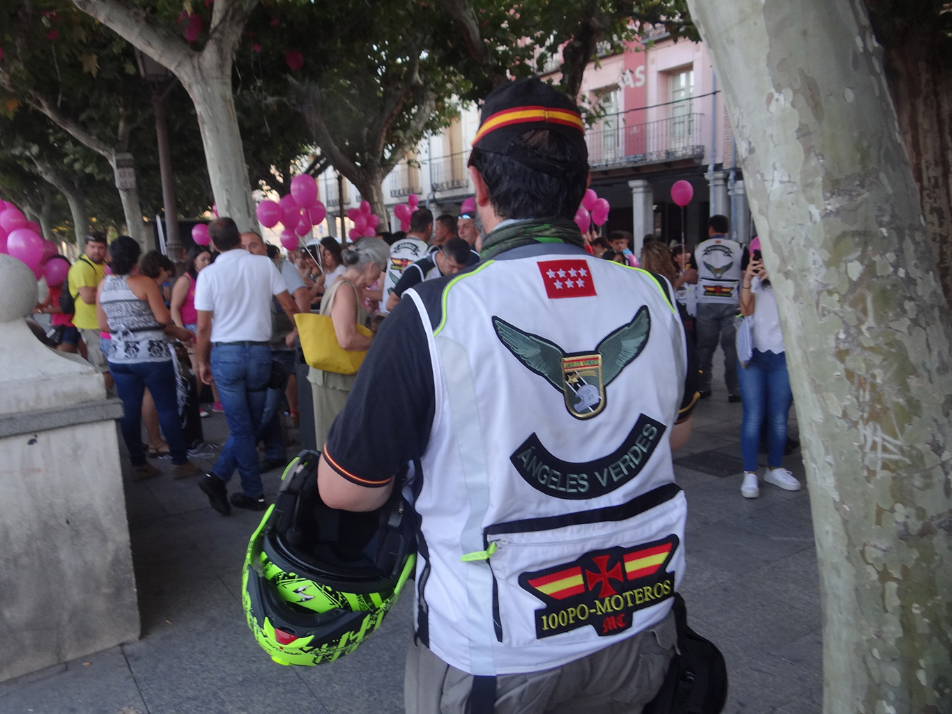 Además una pequeña concentración motera llenó de ruido la Plaza de Cervantes y ofreció imágenes curiosas y muy solidarias que combinaban chalecos de cuero con globos rosas junto a la estatua del Príncipe de los Ingenios.
