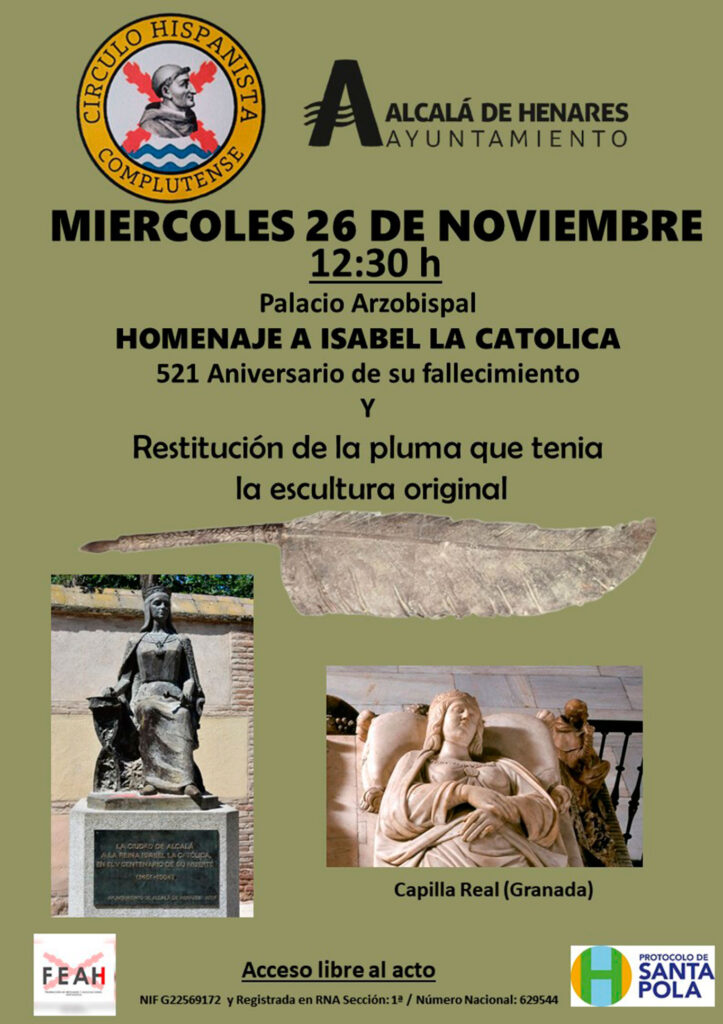 El próximo miércoles, 26 de noviembre, a las 12:30 horas, el Círculo Hispanista Complutense realizará un sencillo acto en Homenaje a la reina Isabel la Católica con motivo del 521 aniversario de su fallecimiento y su inseparable relación con Alcalá de Henares.