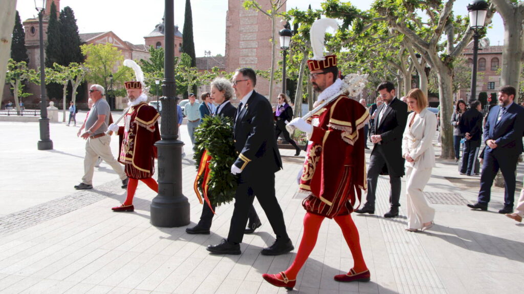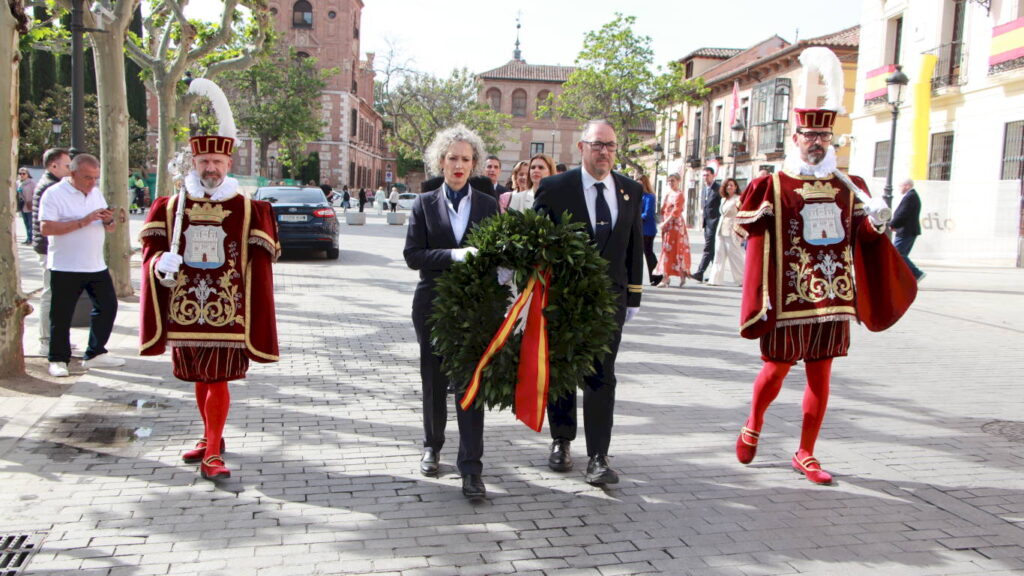 Antes del acto en la Cisneriana, y como es tradición todos los 23 de abril, la Corporación, presidida por la alcaldesa Judith Piquet, ha colocado una corona de laurel a los pies de la estatua de Cervantes en la plaza que se lleva su nombre, en procesión cívica desde la puerta del Ayuntamiento, para conmemorar el aniversario del día en que recibió sepultura el escritor en 1616.