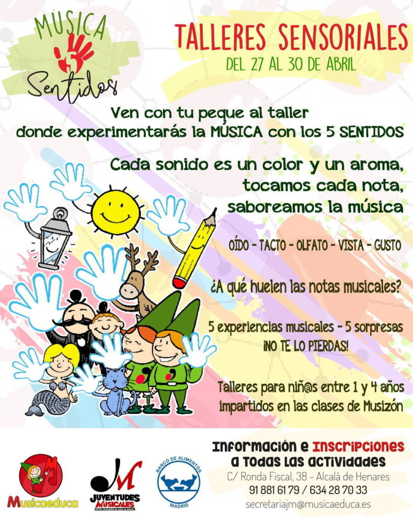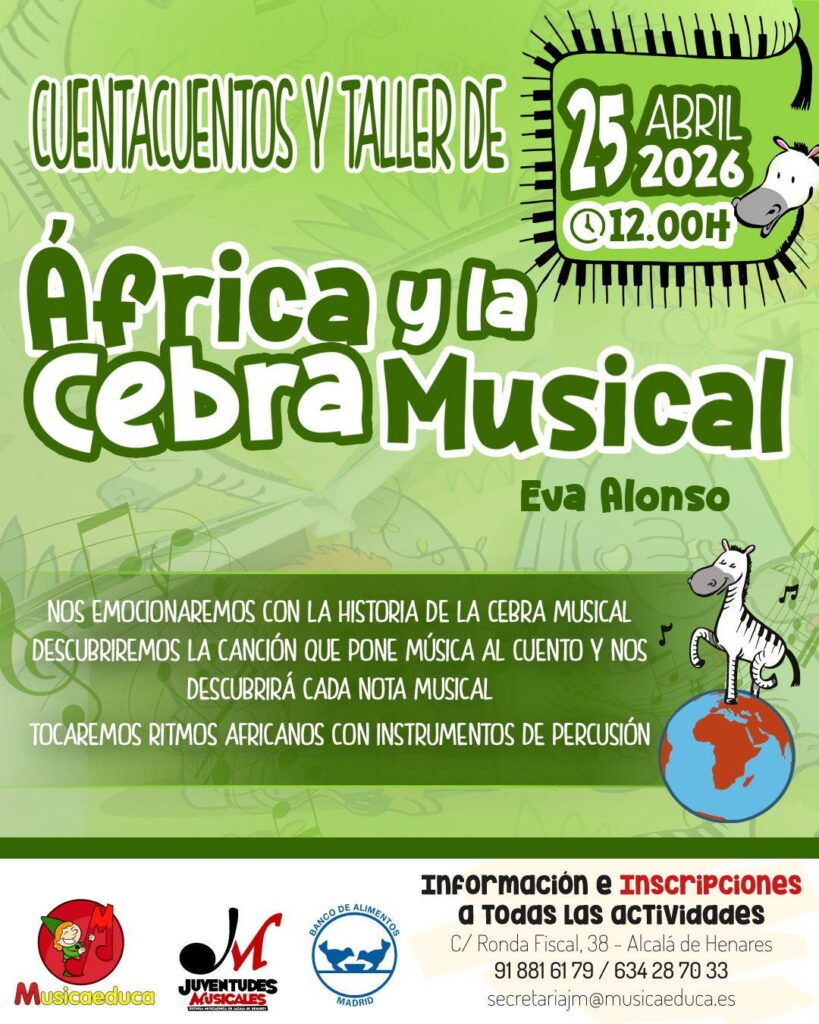- Para los más pequeños (1-4 años): Taller «Música-5 sentidos» en las clases de Musizón y el Cuentacuentos «África y la cebra musical» (2-6 años).