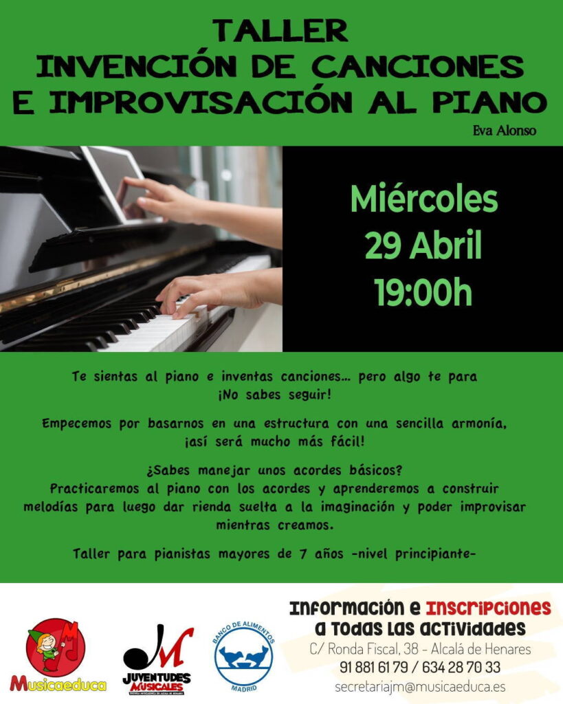 - Miércoles 29 abr: Muestras de Arpa, Guitarra y Teclado. Talleres de improvisación al piano y Lenguaje Musical.