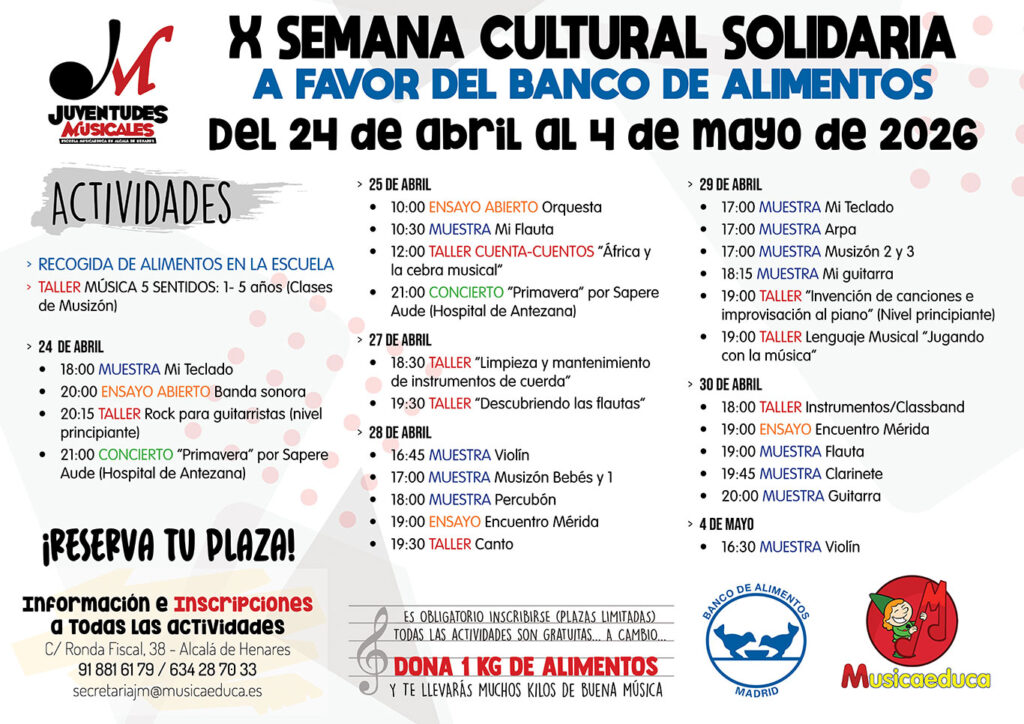 ¡Alcalá se llena de música y solidaridad! La Escuela de Música Juventudes Musicales celebra la décima edición de su Semana Cultural Solidaria del 24 de abril al 4 de mayo, y este año el mensaje es claro: abrimos nuestras puertas a toda la ciudad. No importa si nunca has tocado un instrumento o si tus hijos no son alumnos del centro; todas las familias, niños y amigos de Alcalá están invitados a entrar, participar y disfrutar de la música.