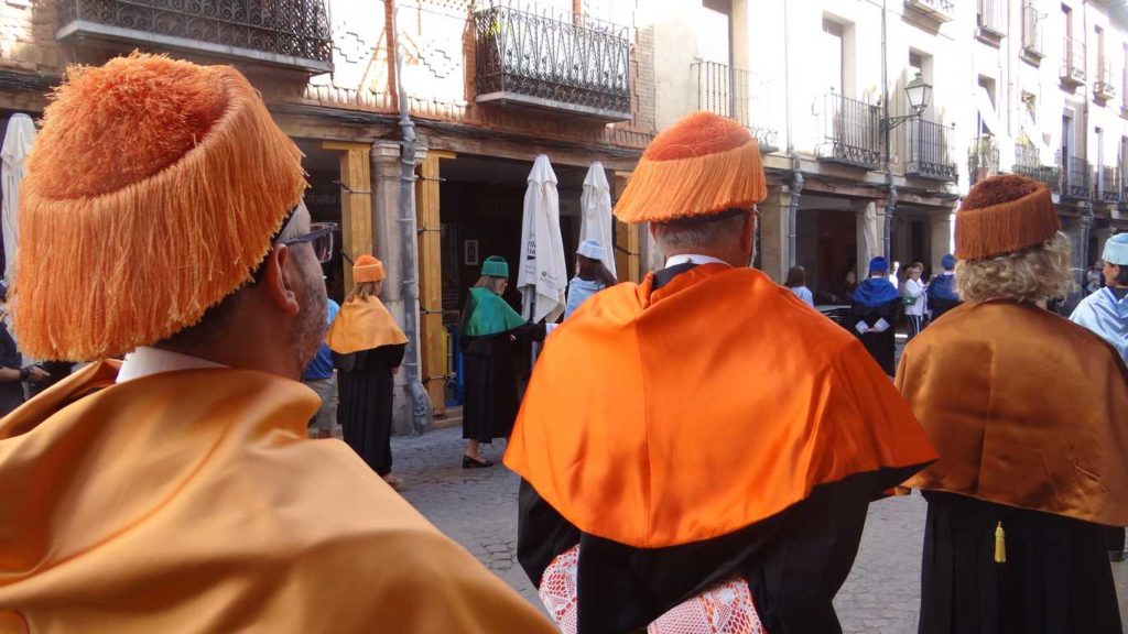 Las togas negras se combinaban con los colores de los saberes representados en este acto en birretes y mucetas. El azul claro de Filosofía y Letras, el azul oscuro de las Ciencias, el amarillo de la Medicina, el cobrizo de Ingenieros y Arquitectos, el naranja de las ciencias Económicas, el verde claro de Ciencias del deporte, el verde Oscuro de ciencias ambientales y el rojo del Derecho.