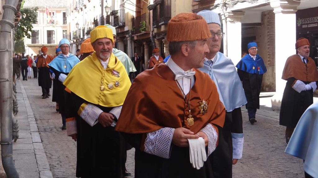 A continuación, la comitiva inició su tradicional recorrido hacia el Rectorado, atravesando las calles más representativas del centro histórico de la ciudad. Desde la Santa e Insigne, pasando por la plaza de los Santos Niños, calle Mayor, plaza de Cervantes, calle Bustamante de la Cámara y plaza de San Diego para entrar a la Cisneriana.