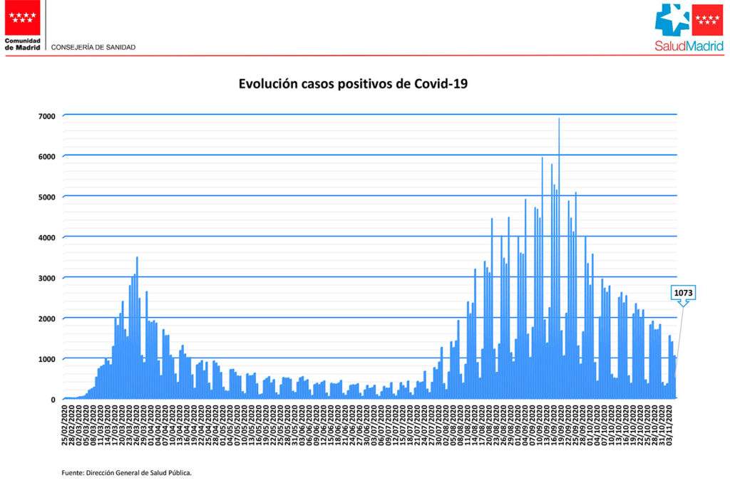 Al cierre del día anterior, el viernes 6 de noviembre, la Comunidad de Madrid suma un total de 325.580 pacientes afectados por COVID-19 en datos contrastados con prueba PCR. La Consejería de Sanidad ofrece el dato de 2.347 casos nuevos notificados incorporados, 1.073 de ellos en las últimas 24 horas. La cifra del último día desciende en 170 casos