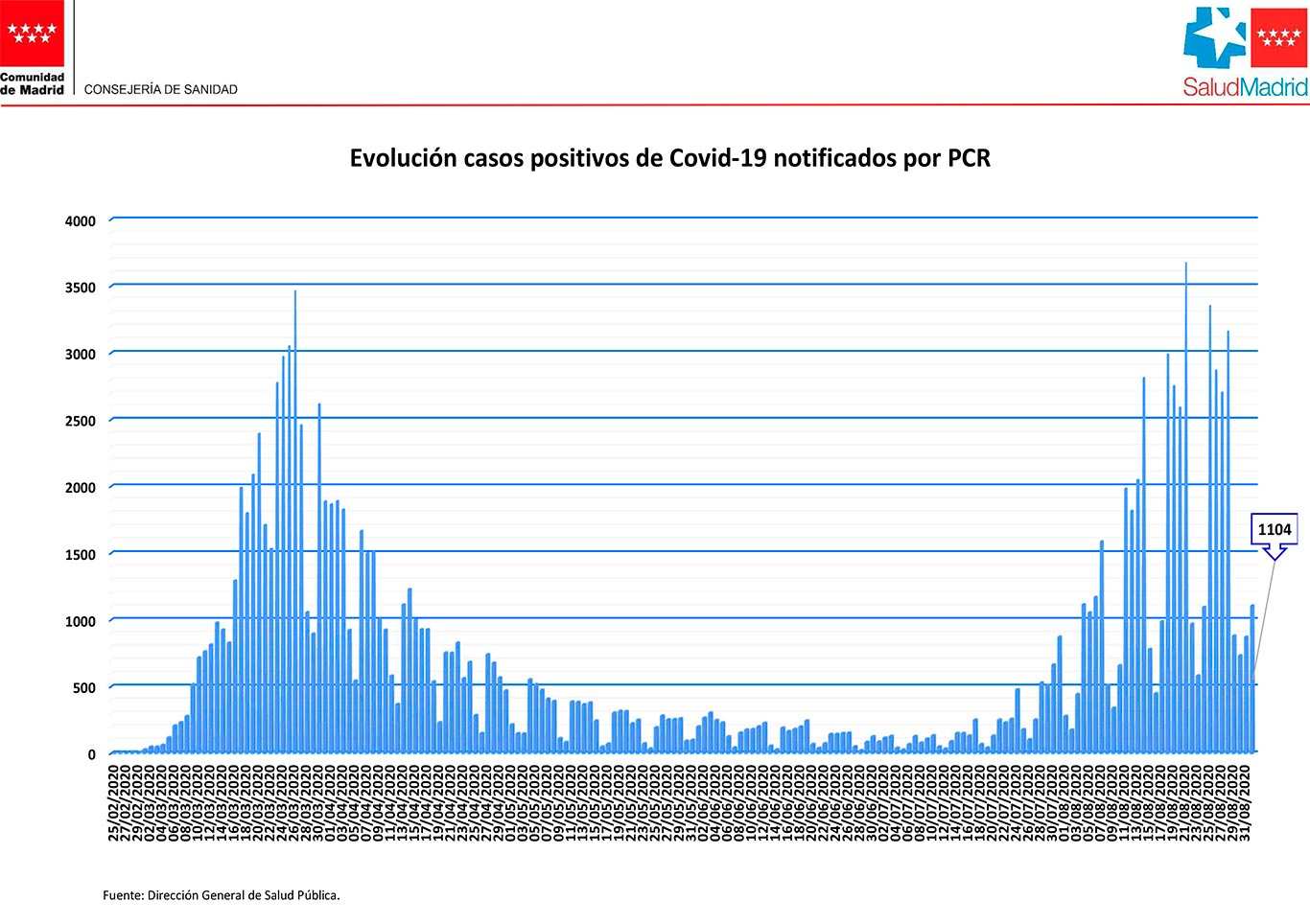 Al cierre del día de ayer, 2 de septiembre, la Comunidad de Madrid suma un total de 134.459 pacientes afectados por COVID-19 en datos contrastados con prueba PCR. La Consejería de Sanidad ofrece el dato de 2.617 casos nuevos notificados incorporados, 1.104 de ellos en las últimas 24 horas.