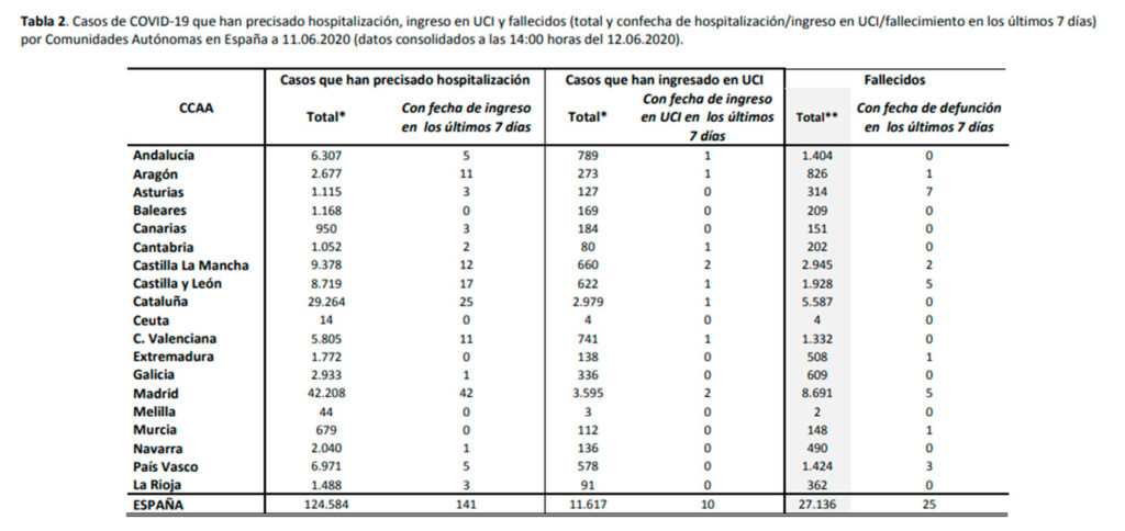 Datos oficiales del Ministerio de Sanidad en toda España 12 de junio (14:00 horas)