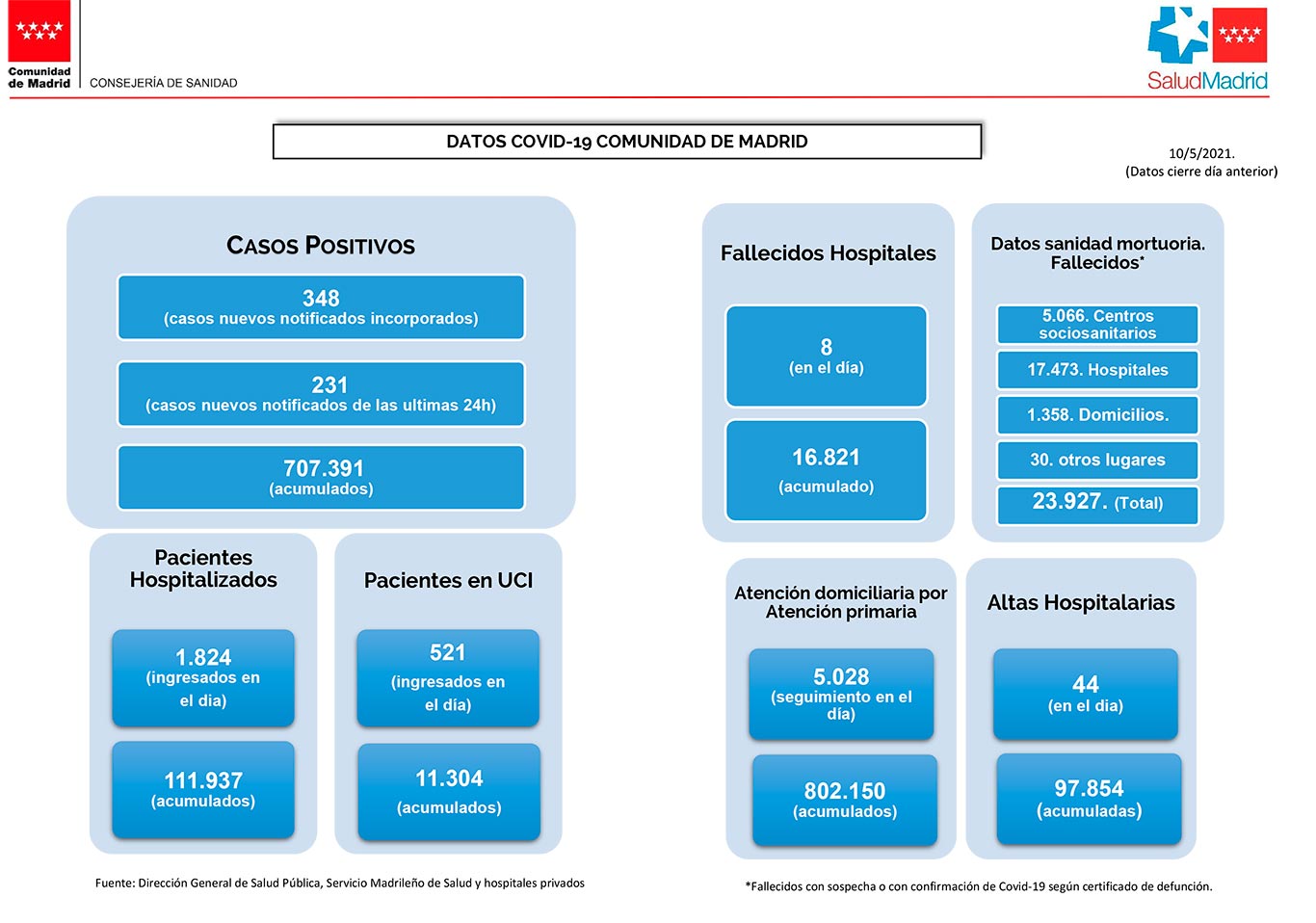 Al cierre del día anterior, el lunes 10 de mayo, la Comunidad de Madrid suma un total de 707.391 pacientes afectados por coronavirus en datos contrastados desde el inicio de la pandemia. La Consejería de Sanidad ofrece el dato de 348 casos nuevos notificados incorporados, 231 de ellos en las últimas 24 horas.