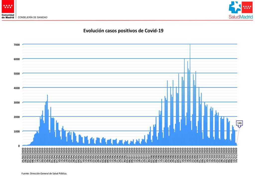 Al cierre del día anterior, el lunes 16 de noviembre, la Comunidad de Madrid suma un total de 339.913 pacientes afectados por COVID-19 en datos contrastados con prueba PCR. La Consejería de Sanidad ofrece el dato de 324 casos nuevos notificados incorporados, 146 de ellos en las últimas 24 horas.