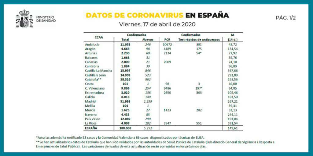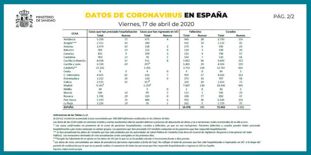 El número de ingresados en la UCI, es de 1.154 a fecha 17 de abril, por primera vez descienden de los 1.200. Las cifras de los ingresados en UCI son datos de prevalencia (personas ingresadas a fecha de hoy). No reflejan el total de personas que han sido hospitalizadas o ingresadas en UCI a lo largo del periodo de notificación.