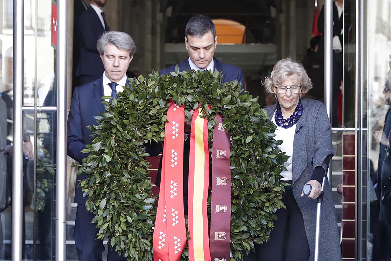 El presidente de la Comunidad de Madrid, Ángel Garrido, y la alcaldesa de la capital, Manuela Carmena, acompañados del presidente del Gobierno, Pedro Sánchez, han depositado una corona de laurel ante la placa en la Real Casa de Correos que recuerda a las víctimas de los atentados del 11 de marzo de 2004, así como a los servicios de emergencias y ciudadanos que las auxiliaron.