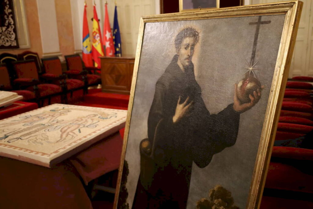 En esta ocasión, se presenta una selección de bienes muebles que ejemplifican esta labor discreta y continua. Entre ellos destacan: un óleo sobre lienzo de San Juan de Dios del siglo XVII; cuatro reposteros de 1945 pertenecientes al patrimonio de la Casa Consistorial; tres placas direccionales de la antigua señalética de la ciudad; la reproducción del Mosaico de Cupidos de Complutum, realizada en la década de 1990 a partir del original conservado en el Museo Arqueológico Nacional, recientemente restaurada; una maqueta de la Alhambra realizada en la segunda mitad del siglo XIX en la escuela de Rafael Contreras, y también un lienzo de Santa María Egipciaca del siglo XVII.